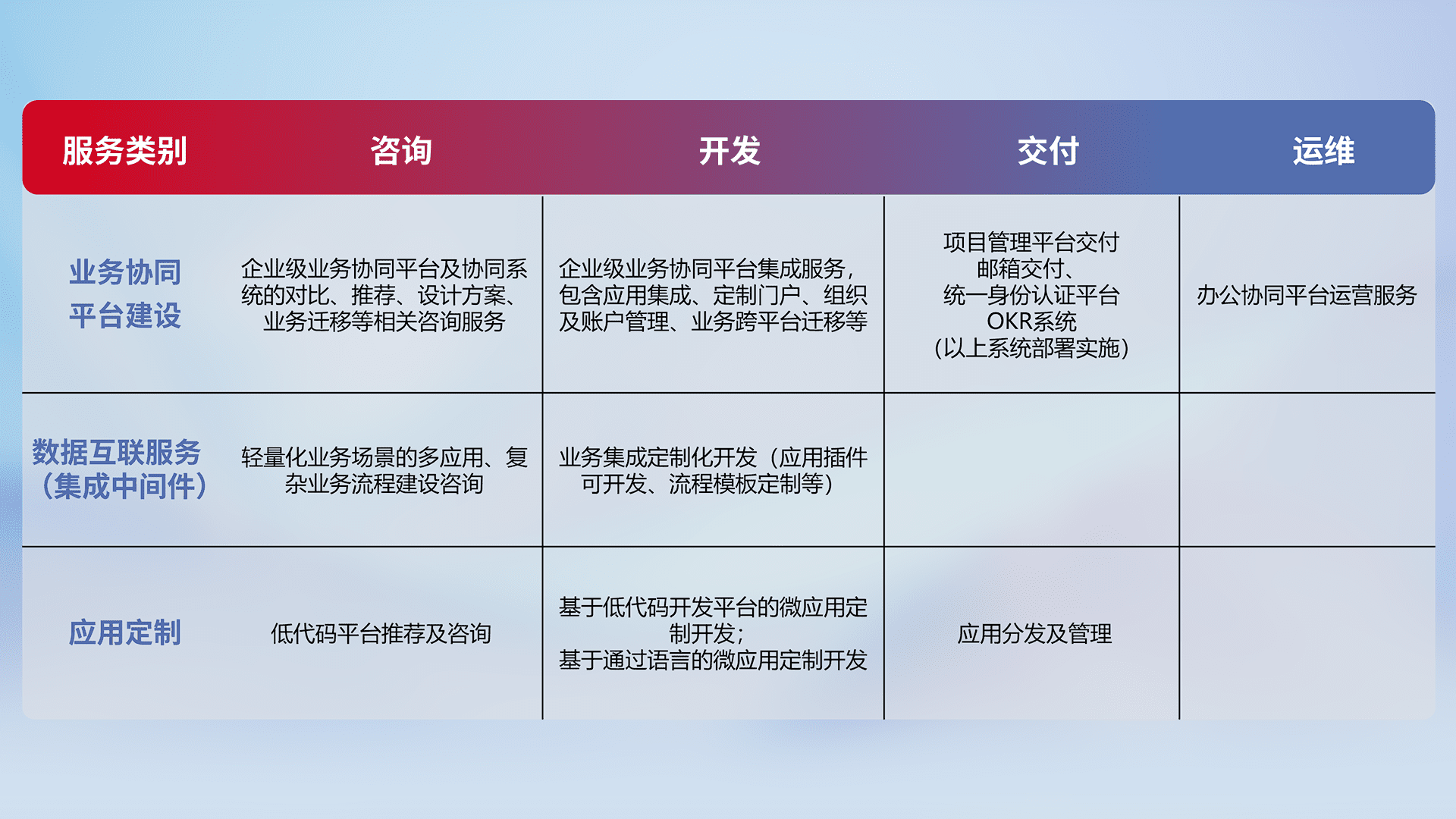 针对钉钉、、企微、、IDaas等平台级产品提供产品的规划、、方案、、、、交付、、、定制化开发等服务,,,,实现如统一协同办公、、、智能客户服务、、、混合会议管理、、、、智能数据查询、、等业务场景,,实现数字化转型。。。