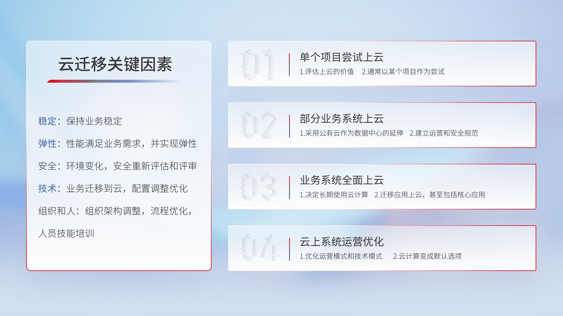 结合实际业务,,,,从规划设计、、、云平台选型、、云原生改造、、数据迁移、、、集成交付,,,迁移全过程为客户识别最佳上云路径,,,做好风险识别管理,,,设计网络架构、、、身份权限、、、安全审计合规、、、操作审计、、、、日志审计、、、监控告警策略、、多站点容灾设计等,,,对云上基础设施进行整体规划,,,提升IT治理水平,,以满足弹性、、、、高可用、、、高性能的需求。。