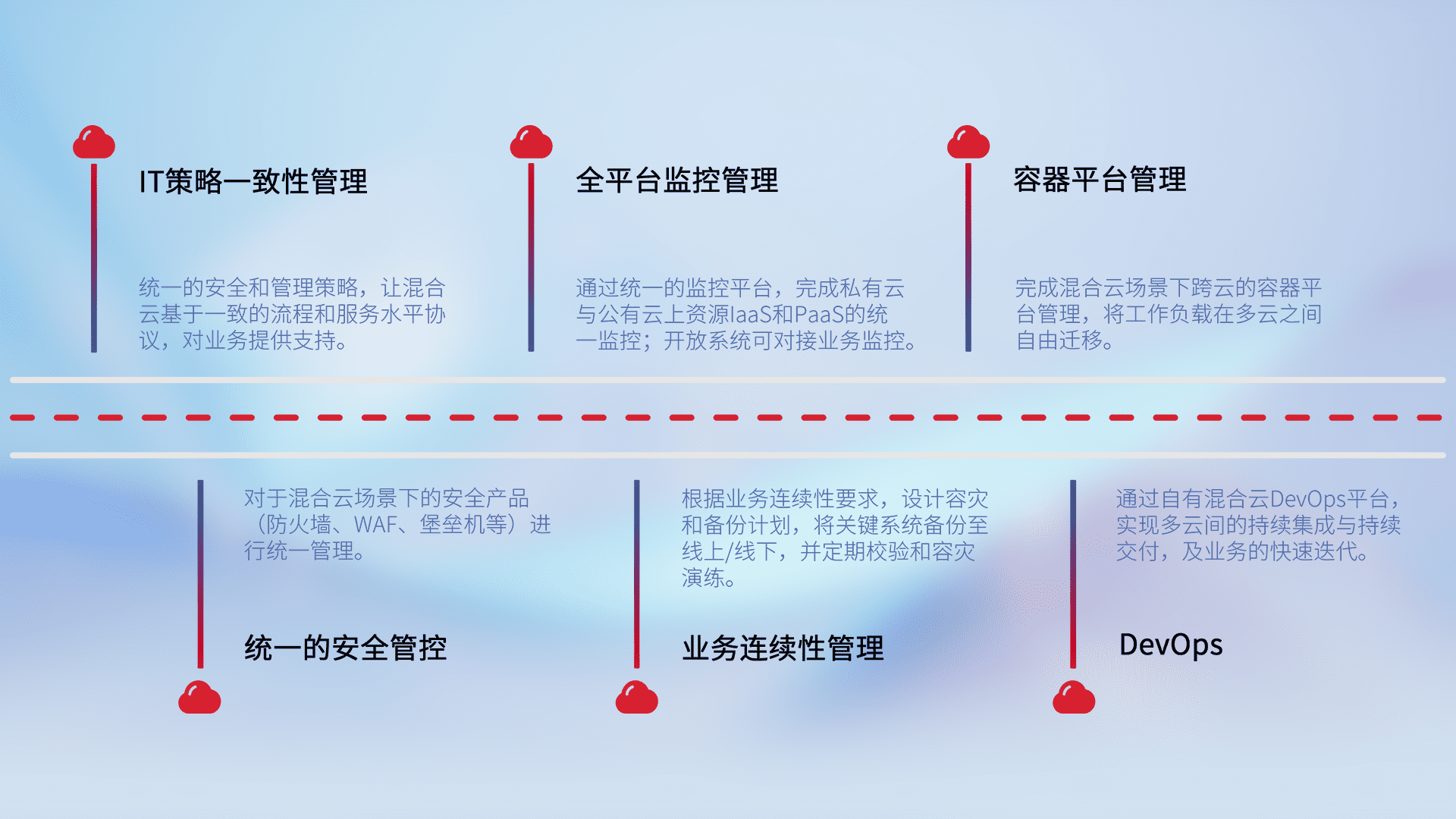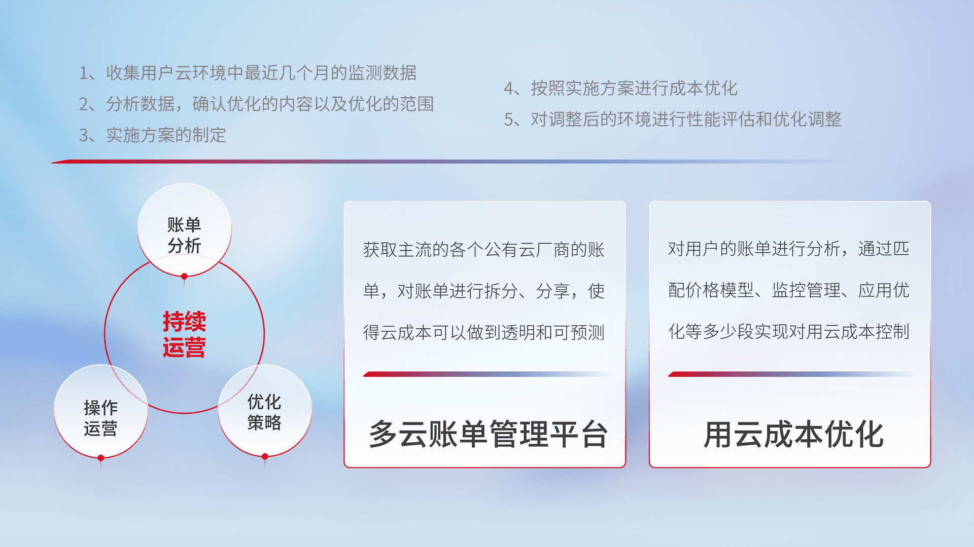通过多云纳管,,以统一的资源数据模型把客户的云资源进行抽象和封装,,,,进而实现对多云资源的统一操作,,保障云资源管理的可靠性、、、稳定性与可用性。。。。量身定制化运维内容,,,配置、、、、开发运维、、、补丁管理、、、备份、、、监控、、认证和访问管理、、、、审计和日常巡检等,,保障在用云过程中的可靠度,,,稳定度以及高可用率。。